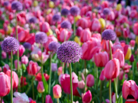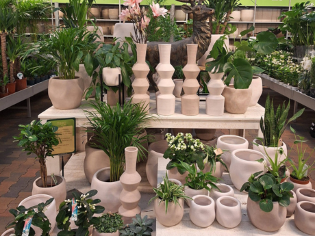 Om wat kleur in uw tuin te hebben, plaats bloeiende primula's en violen op de tuintafel.